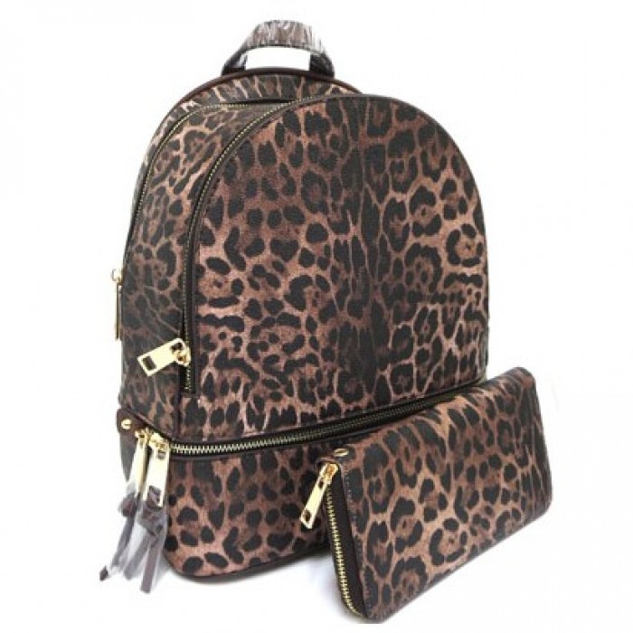 LE1062W-BROWN LEOPARD PU LEATHER MEDIUM BACKPACK WITH MATCHING WALLET