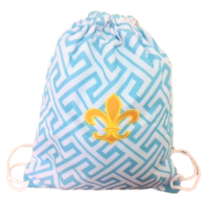 AQUA GREEK KEY DESIGN W/GOLD FDL DRAWSTRING BACK PACK BAG