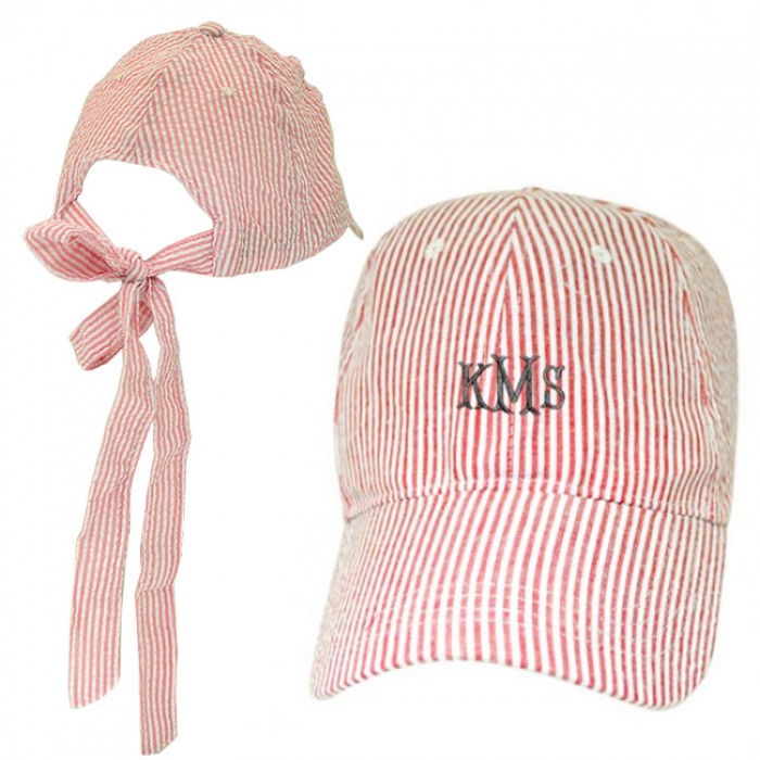RED COTTON SEER SUCKER CAP W/ BOW ON BACK