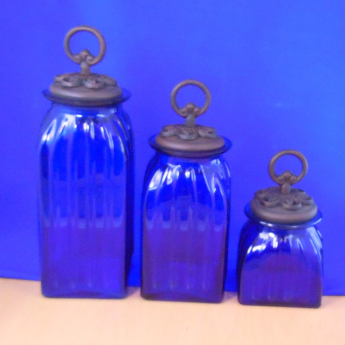 40074BLUE - SQUARE MEDIUM BLUE CANISTER SET / W COPPER RING LIDS