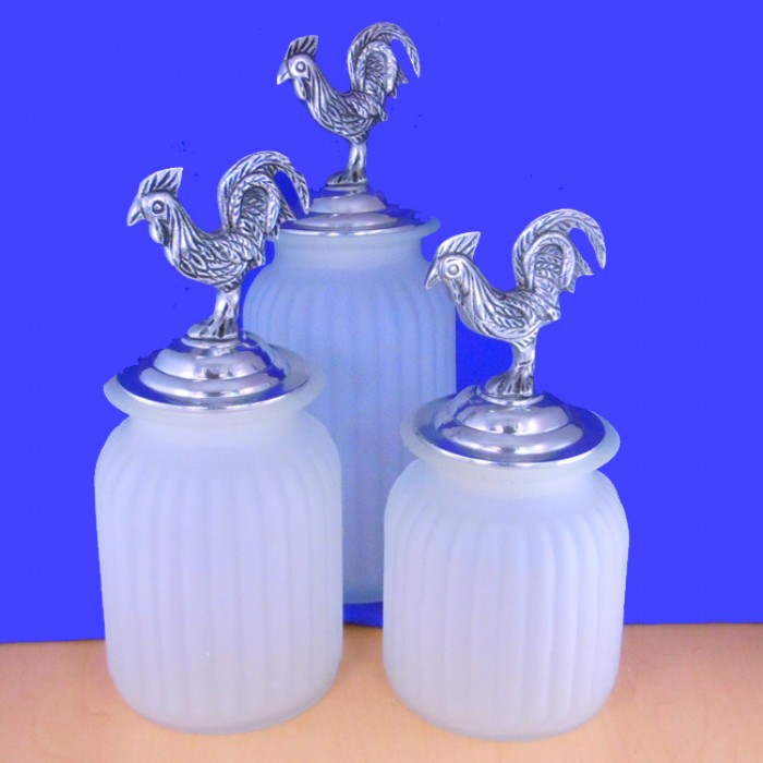LARGE ROUND FROSTED CANISTER SET W/ ROOSTER LIDS