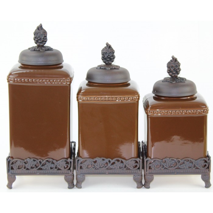 60003 BROWN CERAMIC LARGE CANISTER SET W / GRAPE COPPER LIDS & BASE