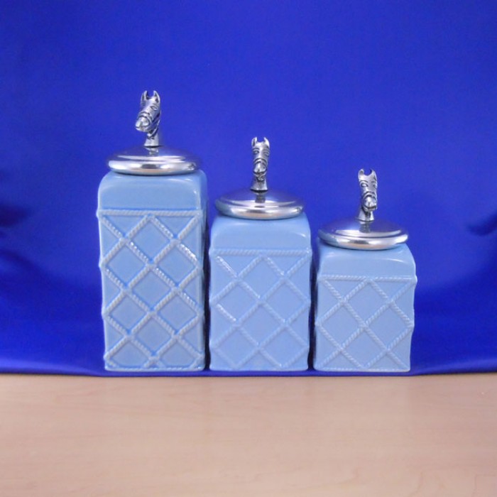 CERAMIC CANISTER SET ROPE BLUE W/ HORSE SILVER LIDS