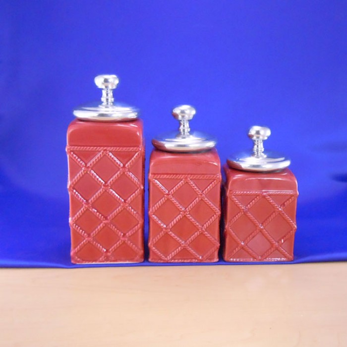 CERAMIC CANISTER SET ROPE RED W/ SILVER PLAIN KNOB LIDS