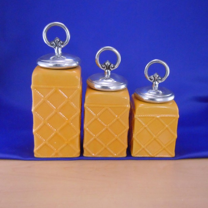 CERAMIC CANISTER SET ROPE YELLOW W/ RING SILVER LIDS