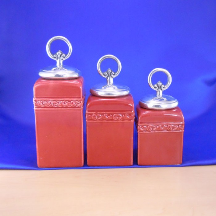 CERAMIC CANISTER SET RED W/ RING SILVER LIDS