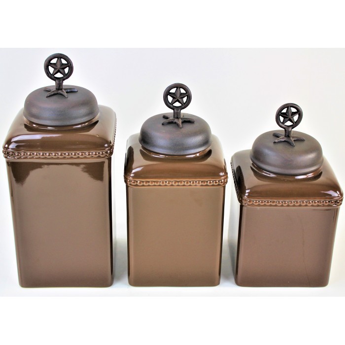 CERAMIC LARGE BROWN CANISTER SET W / COPPER STAR LIDS