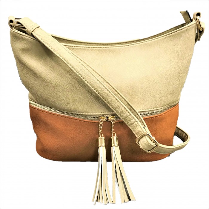 AM3016C-BEIGE/COGNAC BUCKET VEGAN LEATHER CROSSBODY BAG