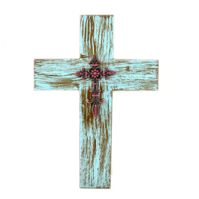 1238-FDL - TURQUOISE METAL WALL CROSS W/ PINK CRYSTAL FLEUR DE LIS