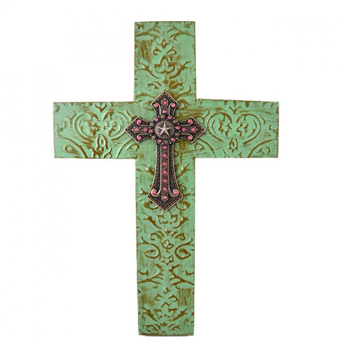 DAMASK MINT METAL CROSS W/ PINK CRYSTAL STAR