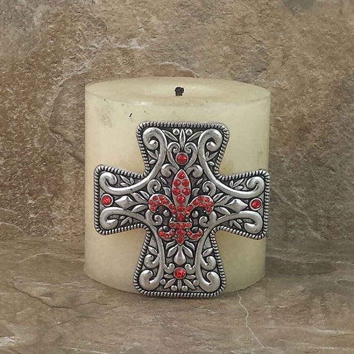 SILVER CROSS CANDLE PIN W / RED STONE FDL