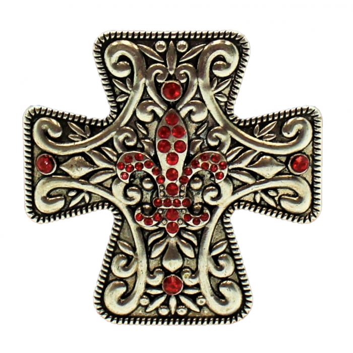 7001-SIL-RED - SILVER CROSS CANDLE PIN W / RED STONE FDL