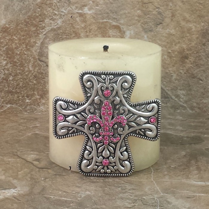 SILVER CROSS CANDLE PIN W / PINK STONE FDL