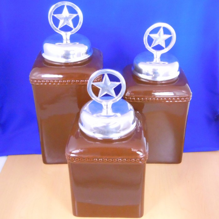 CERAMIC LARGE BROWN CANISTER SET W / SILVER STAR LIDS