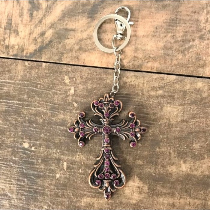 7017-PURPLE CRYSTAL CROSS / COPPER KEY CHAIN HOLDER