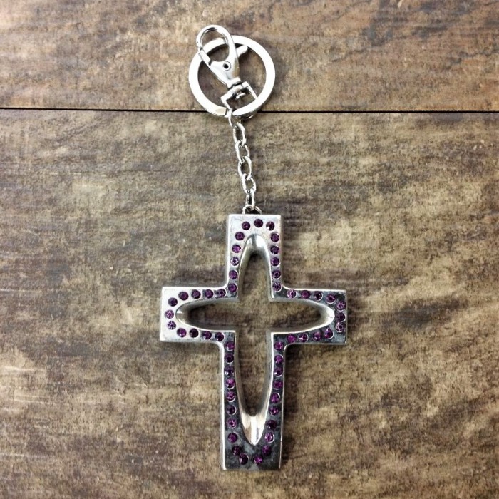 PURPLE CRYSTAL CROSS / SILVER KEY CHAIN HOLDER
