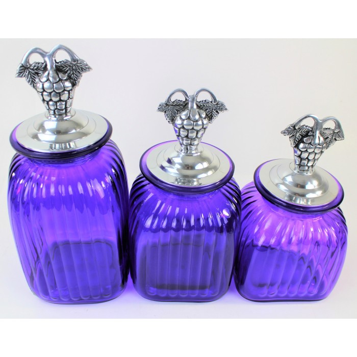 SQUARE LARGE PURPLE CANISTER SET W/ SILVER GRAPE LIDS